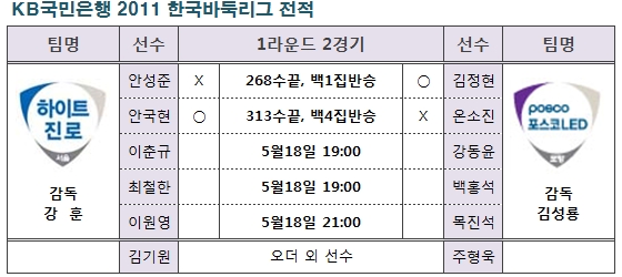ÇÏÀÌÆ®Áø·Î¿Í Æ÷½ºÄÚLEDÀÇ 1¶ó¿îµå µÎ ¹øÂ° °æ±â´Â ±×·¯³ª ´çÃÊ ÀÏÁ¤´ë·Î ÁÖ¸»ÀÎ 14, 15ÀÏ¿¡ Ä¡¸£Áö ¸øÇϰí 15Àϰú 18ÀÏ·Î ¹Ì·ïÁ³´Ù. ÃÖöÇѰú ÀÌ¿ø¿µ(ÇÏÀÌÆ®Áø·Î), °µ¿À±°ú ¹éÈ«¼®(Æ÷½ºÄÚLED) µî ¾çÆÀ ÁÖÀü±Þ ¼±¼öµéÀÌ Áß±¹¸®±×¿¡ ÃâÀü ÁßÀÌ¾î¼ µÎ ÆÀ ¸ðµÎ °æ±â¿¡ ÇÊ¿äÇÑ ¼±¼ö ´Ù¼¸ ¸íÀ» ¸ÂÃâ ¼ö ¾ø±â ¶§¹®ÀÌ´Ù. ±×·¡¼ 15ÀÏ¿¡ ÀÏ´Ü ¾È¼ºÁØ - ±èÁ¤Çö, ¾È±¹Çö - ¿Â¼ÒÁø µî ¾çÆÀ¿¡¼ Áß±¹¸®±×¿¡ ³ª°¡Áö ¾ÊÀº ¼±¼öµé³¢¸® ¸ÕÀú °æ±â¸¦ Ä¡¸£°í ³ª¸ÓÁö ¼¼ ÆÇÀº Áß±¹¸®±× ÃâÀü ¼±¼öµéÀÌ ±Í±¹ÇÑ ÈÄÀÎ 18ÀÏ¿¡ ¼Ó°³Å°·Î Çß´Ù.
