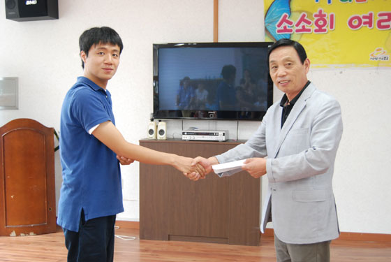¡ã ¼Ò¼Òȸ ºÎȸÀå ÀÌ¿µ±¸ 8´ÜÀÌ »ç¶ûÀÇ Áý ¹Ú½Å¿õ ¿øÀå¿¡°Ô ÈÄ¿ø±ÝÀ» Àü´ÞÇϰí ÀÖ´Ù.