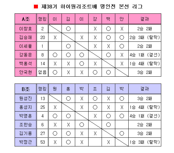 ÀÌ·Î½á ¸íÀÎÀüÀº °µ¿À± ¹Ú¿µÈÆÀ» °¢Á¶ 1À§·Î ¿Ã·Á³õ¾ÒÁö¸¸, ¸®±× 2À§´Â ¿©ÀüÈ÷ È¥¹ÌÇÑ »óÅÂÀÌ´Ù. AÁ¶´Â 19ÀÏ(¸ñ) ¹ú¾îÁö´Â ÀÌâȣ-À̼¼µ¹(°¢ 2½Â2ÆÐ)ÀÇ ½ÂÀÚ¿Í ¾È±¹Çö(3½Â2ÆÐ)ÀÇ ½ÂÀÚ°¡ µ¿·üÀç´ë±¹À» °¡Á® ½ÂÀÚ°¡ Á¶2À§·Î È®Á¤µÈ´Ù.