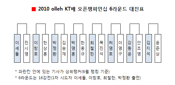7¿ù 20ÀÏ ¹ÙµÏTV ½ºÆ©µð¿À¿¡¼ ¿¹Á¤µÇ¾î ÀÖ´ø Á¦1ȸ KT¹è ¿ÀÇÂèÇǾð½Ê 5¶ó¿îµå ¸¶Áö¸· ´ë°á Á¶Çѽ ´ë Áø½Ã¿µÀÇ ´ë°áÀÌ Ãë¼ÒµÆ´Ù. Á¶ÇѽÂÀÌ ÈÞ°¡¸¦ ³ª¿ÀÁö ¸øÇØ ´ë±¹¿¡ Âü°¡ÇÒ ¼ö ¾ø¾ú´ø °ÍÀÌ´Ù. µû¶ó¼ Áø½Ã¿µÀÌ ±â±Ç½ÂÀ¸·Î ¸¶Áö¸· 6¶ó¿îµå ÁøÃâ Çà¿îÀ» ¾ò¾ú´Ù.