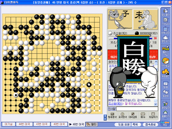 °¢ µ¿È£È¸¿¡¼ 30¸íÀÇ ¼±¼ö°¡ ÃâÀüÇØ ´ÜÆÇ ½ÂºÎ·Î ÁøÇàµÆ°í. ±× °á°ú Àåºñ»ç¶ûµ¿È£È¸°¡ 14:16À¸·Î ¾Æ½±°Ô ÆÐÇÏ°í ¸»¾Ò´Ù. Áö³ ÆÐ¹è ¶§¹®ÀÎÁö zhutou, roz µî ¸·°ÇÑ 9´ÜµéÀ» ¾Õ¼¼¿î mojiaoÀÇ Àü·ÂÀÌ ¸¸¸¸Ä¡ ¾Ê¾Ò´ø Å¿ÀÌ´Ù.