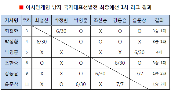 6¿ù 29ÀÏ ¿ÀÈÄ 2½Ã, Çѱ¹±â¿ø º»¼±´ë±¹½Ç¿¡¼ ¿¸° ¾Æ½Ã¾È°ÔÀÓ ³²ÀÚ±¹°¡´ëÇ¥¼±¹ßÀü ÃÖÁ¾¿¹¼± 1Â÷¸®±×¿¡¼ ¹ÚÁ¤È¯°ú ÃÖöÇÑÀÌ °¢°¢ Á¶ÇѽÂ, ¹Ú¿µÈÆÀ» ²ª°í 3½Â¿¡ µµ´ÞÇß´Ù.