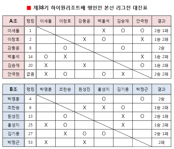 º»¼±Àº 6¸í ¾¿ A, BÁ¶ ¸®±×·Î ³ª´µ¾î ÁøÇàµÇ¸ç °¢ »óÀ§ 2¸í(ÃÑ 4¸í)Àº °á¼±¿¡ ÁøÃâÇÏ°Ô µÈ´Ù. BÁ¶¿¡¼´Â ¹Ú¿µÈÆ, ¿ø¼ºÁø, ±è±â¿ëÀÌ 2½ÂÀ¸·Î ¼±µÎ¸¦ ´Þ¸®°í ÀÖ´Ù.