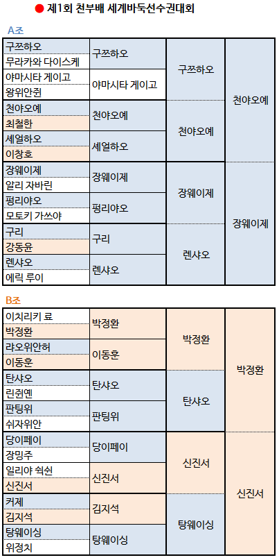 À̳¯ °á°ú·Î BÁ¶ 1À§·Î 4°¿¡ ÁøÃâÇÑ ¹ÚÁ¤È¯Àº AÁ¶ 2À§ÀΠõ¾ß¿À¿¹¿Í ¸ÂºÙ°Ô µÇ¸ç, BÁ¶ 2À§ ½ÅÁø¼´Â AÁ¶ 1À§ Àå¿þÀÌÁ¦¸¦ »ó´ëÇÑ´Ù. »ó´ëÀüÀûÀº ¹ÚÁ¤È¯ÀÌ Ãµ¾ß¿À¿¹¿¡°Ô 13½Â20ÆÐ, ½ÅÁø¼°¡ Àå¿þÀÌÁ¦¿¡°Ô 1ÆÐ¸¦ ±â·Ï ÁßÀÌ´Ù. 4°ÀüÀº 12¿ù21ÀÏ, °á½ÂÀº 3¹ø±â·Î 23ÀϺÎÅÍ ¿¸± ¿¹Á¤.