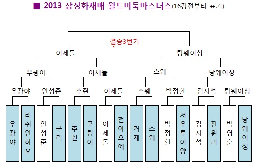 À̼¼µ¹°ú ÅÁ¿þÀ̽ÌÀº ù ¸Â´ë°áÀÌÁö¸¸ °´°üÀûÀÎ Àü·Â»ó ¼¼°è´ëȸ 16ȸ ¿ì½Â¿¡ ºû³ª´Â À̼¼µ¹ÀÌ Ã³À½ °á½Â¿¡ ¿À¸¥ ÅÁ¿þÀ̽ÌÀ» ¾ÐµµÇÑ´Ù. ±×·¯³ª ÅÁ¿þÀ̽ÌÀÇ »ó½Â¼¼°¡ ¿¹»ç·ÓÁö ¾ÊÀºµ¥´Ù À̼¼µ¹ÀÇ ¾î±ú¿¡ Çѱ¹ÀÇ ¿ÃÇØ ù ¼¼°è´ëȸ °³ÀÎÀü ¿ì½ÂÀÌ ´Þ·ÁÀֱ⠶§¹®¿¡ ºÎ´ã°¨ÀÌ ¸¸¸¸Ä¡ ¾ÊÀ» Àü¸ÁÀÌ´Ù.
