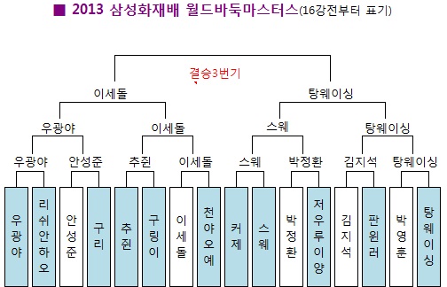 ¿ì½Â»ó±Ý 3¾ï¿øÀÎ 2013 »ï¼ºÈÀç¹è ¿ùµå¹ÙµÏ¸¶½ºÅͽºÀÇ Á¦Çѽð£Àº °¢ 2½Ã°£¿¡ 1ºÐ ÃÊÀбâ 5ȸ¾¿ÀÌ ÁÖ¾îÁø´Ù. ¹ÙµÏ»çÀÌÆ® ŸÀÌÁª¿¡¼´Â 10~12ÀÏ ¿ÀÀü10½ÃºÎÅÍ À̼¼µ¹-ÅÁ¿þÀÌ½Ì °á½Â ¸Â´ë°áÀ» 1±¹ ÀÌÁöÇö, 2±¹ È«¼ºÁöÀÇ ÇØ¼³·Î »ýÁß°èÇÑ´Ù.