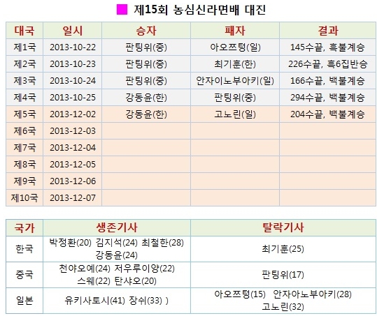 Çѱ¹ Áß±¹ ÀϺ»ÀÇ ±¹°¡´ëÇ¥ 5¸íÀÌ ÃâÀüÇØ ¿¬½ÂÀü ¹æ½ÄÀ¸·Î ´ë°áÇÏ´Â ³ó½É½Å¶ó¸é¹è´Â 1~6ȸ±îÁö Çѱ¹ÀÌ ¿ì½ÂÇßÀ¸¸ç, 7¡9ȸ±îÁö´Â ÀϺ» Çѱ¹ Áß±¹ÀÌ ÇÑÂ÷·Ê¾¿ ¿ì½ÂÀ» ³ª´²°¡Á³°í, 10¡12ȸ ´ëȸ´Â Çѱ¹ÀÌ 3¿¬ÆÐ, 13ȸ ´ëȸ´Â Áß±¹, Áö³ ´ëȸÀÎ 14ȸ¿¡¼´Â Çѱ¹ÀÌ ¿ì½ÂÇß´Ù.