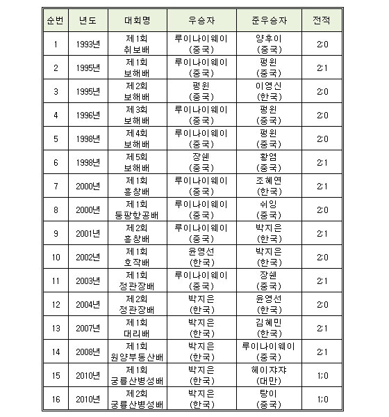 ÇöÀç±îÁö ¿©ÀÚ¼¼°è´ëȸ °³ÀÎÀüÀº ÃÑ 16ȸ Ä¡·¯Áø ¹Ù ÀÖÀ¸¸ç, ±× Áß ·çÀ̳ªÀÌ¿þÀ̰¡ ¿©ÀÚ¼¼°è´ëȸ °³ÀÎÀü¿¡¼ ÃÑ 8¹ø ¿ì½ÂÀ¸·Î ÃÖ´Ù ¿ì½Â ±â·ÏÀ» °¡Áö°í ÀÖ´Â »óȲÀÌ´Ù.