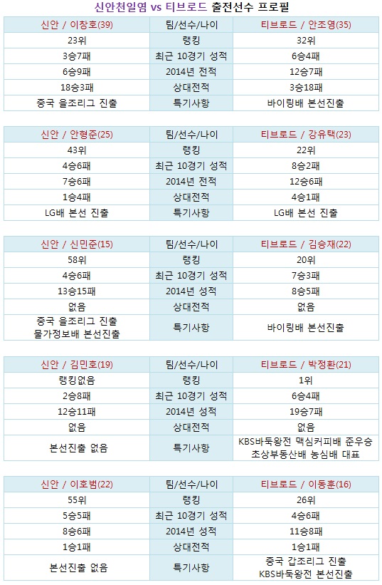 ±× ¿Ü ¾ÈÇüÁØ-°À¯ÅÃ, ½Å¹ÎÁØ-±è½ÂÀç, ±è¹ÎÈ£-¹ÚÁ¤È¯(ÀÌ»ó ¾ÕÀÌ ½Å¾È)ÀÇ °æ¿ì´Â ¸ðµÎ Ƽºê·Îµå°¡ ¿ì¼¼ÇÏ´Ù. ½Å¾ÈÀÇ À§ 3¸í ¼±¼ö Áß ÃÖ±Ù 10°æ±â ¼ºÀûÀÌ 5ÇÒ ÀÌ»ó µÇ´Â ¼±¼ö´Â ¾Æ¹«µµ ¾ø´Â ¹Ý¸é, Ƽºê·Îµå´Â ÀüºÎ 6ÇÒ ÀÌ»óÀÌ´Ù. ´Ù¸¸ ÇÑ °¡Áö º¯¼ö´Â °°Àº ¾çõ´ëÀϵµÀå Ãâ½Å µ¿¹®ÀÇ ´ë°áÀÌ ¸¹Àº ¸¸Å, °´°üÀûÀÎ ÆÇ´ÜÀÌ ¿¹Ãø ±âÁØÀÌ µÇÁö ¾ÊÀ» ¼öµµ ÀÖ´Ù´Â °ÍÀÌ´Ù. µ¿¹® ´ë°áÀº ¾ÈÇüÁØ-°À¯ÅÃ, ½Å¹ÎÁØ-±è½ÂÀç, ÀÌÈ£¹ü-À̵¿ÈÆ.