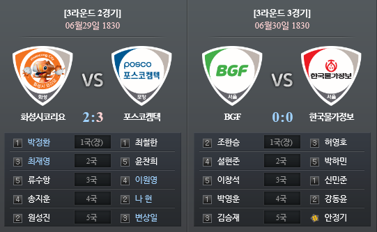 3¶ó¿îµå´Â 6¿ù30ÀÏ 'BGF-Çѱ¹¹°°¡Á¤º¸'ÀÇ ´ë°á·Î ½ÃÀ۵ȴÙ. ´ëÁøÀº 'Á¶ÇѽÂ-Ç㿵ȣ¡®, ¡¯¼³ÇöÁØ-¹ÚÇϹΡ®, ÀÌâ¼®-½Å¹ÎÁØ¡¯, ¡®¹Ú¿µÈÆ-°µ¿À±¡¯, ¡®±è½ÂÀç-¾ÈÁ¤±â¡¯·Î Â¥¿©Á³´Ù.