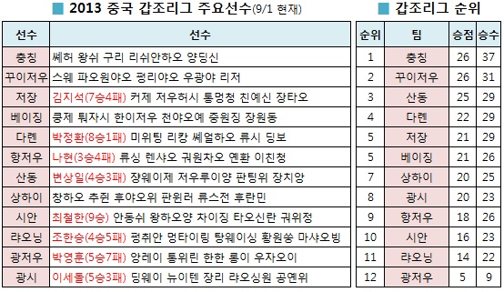 1ÀÏ Áß±¹ °¢Áö¿¡¼´Â 2013Áß±¹°©Á¶¸®±× 13¶ó¿îµå °æ±â°¡ ¿·È´Ù. À̳¯ °æ±â¿¡´Â Çѱ¹±â»ç´Â 6¸íÀÌ ÃâÀüÇÏ¿© ÃÖöÇÑ ±èÁö¼® ¹ÚÁ¤È¯ º¯»óÀÏ µî 4¸íÀº °¢°¢ Ä¿Á¦ ¾Èµ¿½¬ ÅëÀ§¸° ÄôÁ¦ µîÀ» ²ª°í ½Â¸®¸¦ °ÅµÎ¾úÀ¸¸ç, ¹Ú¿µÈÆ Á¶ÇѽÂÀº °¢°¢ ¹ÌÀ§ÆÃ Èľ߿ÀÀ§¿¡°Ô ÆÐÇØ °³ÀÎ ½ÂÁ¡À» ¿Ã¸®´Âµ¥ ½ÇÆÐÇß´Ù.