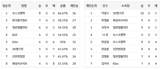 Çѱ¹¹°°¡Á¤º¸´Â À̳¯ ½Â¸®·Î Àü¹Ý±â ¶§ 2´ë3ÀÇ ÆÐ¹èµµ °±¾Ò´Ù. ½Â¸® ½Ã 5ÇÒ ½Â·ü(6½Â6ÆÐ)À» ´Þ¼ºÇϸç Çѱ¹¹°°¡Á¤º¸¿Í Kixx¸¦ µ¿½Ã¿¡ ²ø¾î³»¸± ¼ö ÀÖ¾ú´ø SK¿£Å©¸°Àº 3¿¬½ÂÀÇ È帧ÀÌ ²÷±â¸ç 5½Â7ÆÐ, 6À§¿¡ ¸Ó¹°·¶´Ù.